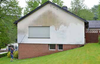 Nach der Einwirkzeit wird die Fassade mit einem exakt abgestimmten Wasserdruck abgespült.