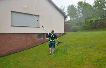 Dank bis zu zehn Meter langer Teleskoplanzen ist kein Gerüst notwendig – die Anwendung erfolgt sicher vom Boden aus.